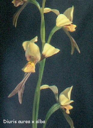 Diuris aurea X alba: One of the most beautiful Diuris-Hybrids. Clear yellow flowers on tall stems. Flowering in the greenhouse in Central-Europe in March for 3 to 4 weeks. Both parents are closely related and the hybrid is fertile. |