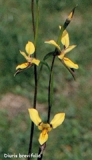 Diuris brevifolia: Endemic (only occuring there) in a small area in South-Australia. Under low scrub and gum trees (Eucalyptus). Late flowering. In Central-Europe from May to June.